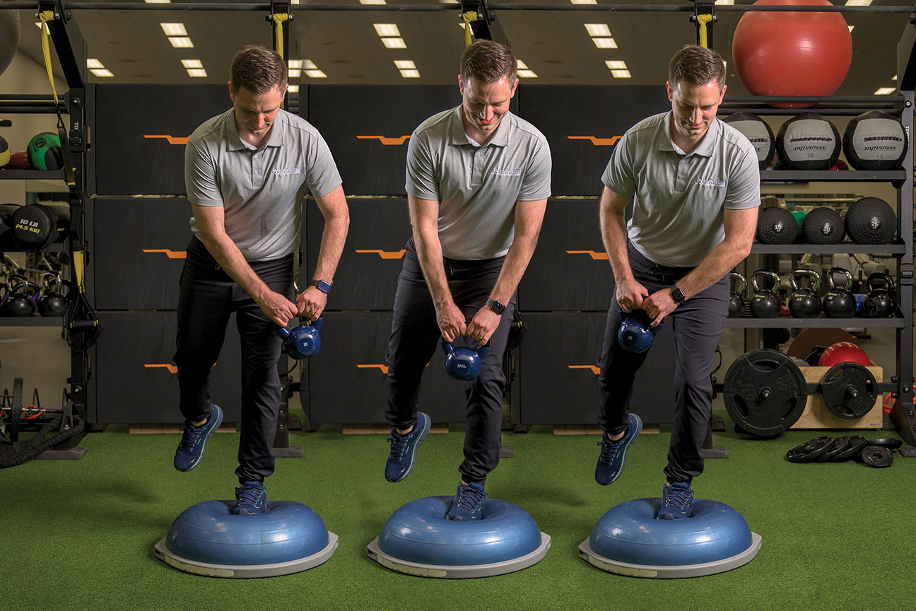 Single Leg on BOSU + Lateral Kettlebell Swing